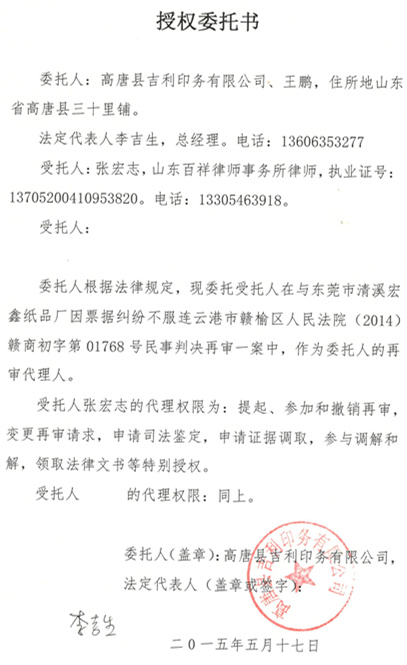 因不服江苏省连云港市赣榆区人民法院(2014)赣商初01768号票据纠纷民事判决,2015.5.17张宏志律师接受山东省高唐县吉利印务有限公司委托,向连云港市中级人民法院提起再审。