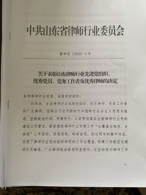 近日,中共山东省律师行业委员会发布《关于表彰山东律师行业先进党组织、优秀党员、党务工作者及优秀律师的决定》(鲁律党[2020]5号),授予全省20名党员律师为“山东省律师行业优秀共产党员”称号,东营张宏志律师获得该殊荣,为东营市律师行业党组织争了光。